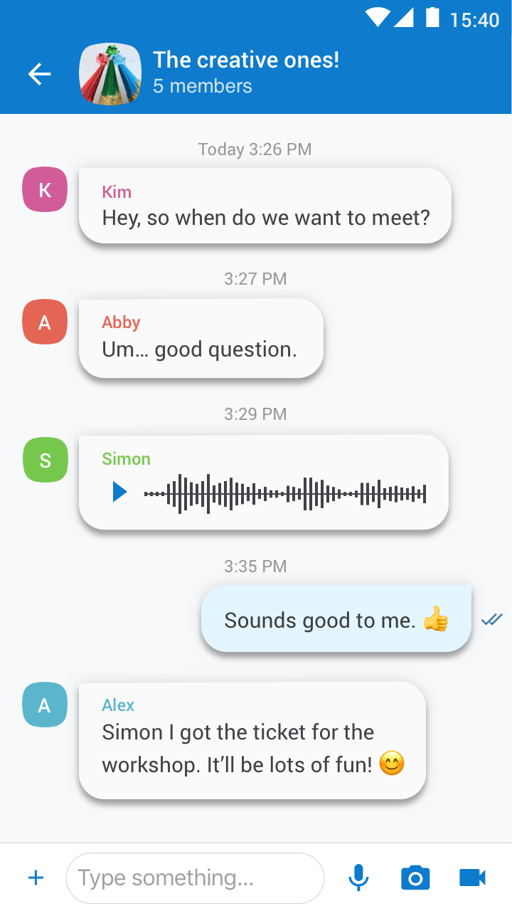 Send and receive texts, voice messages, photos or documents. Your messages are encrypted automatically.